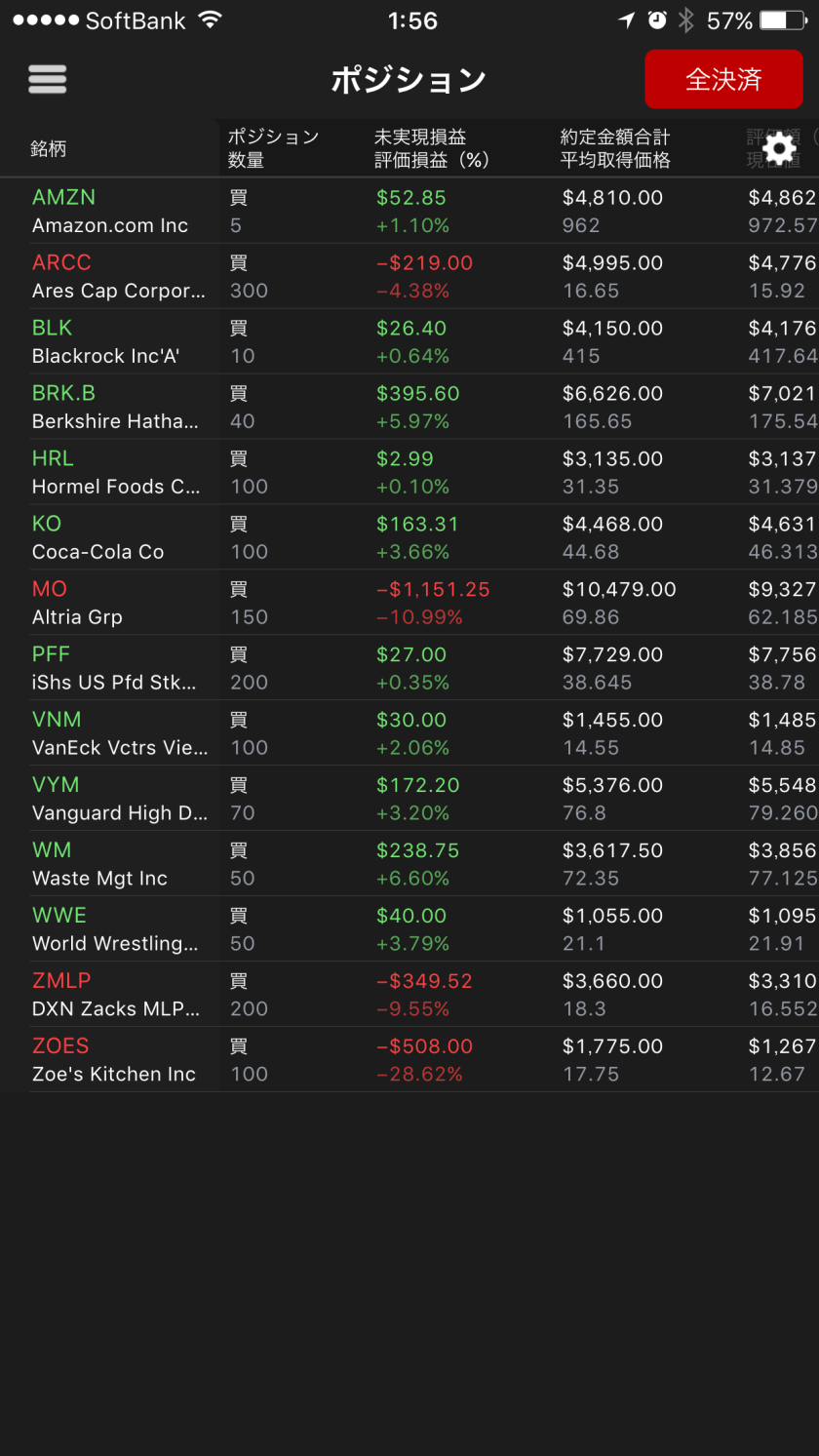下の写真は自分のマネックスのアメリカ株のポジションだ。プラスの銘柄もあるし、手ひどいマイナスの銘柄もある。トータルではマイナスだ。ただ、ざっと眺めて「買ったり負けたりだな」と言うことはできる。これが重要なのだなと感じている。配当も心を支える一要因になるかも。