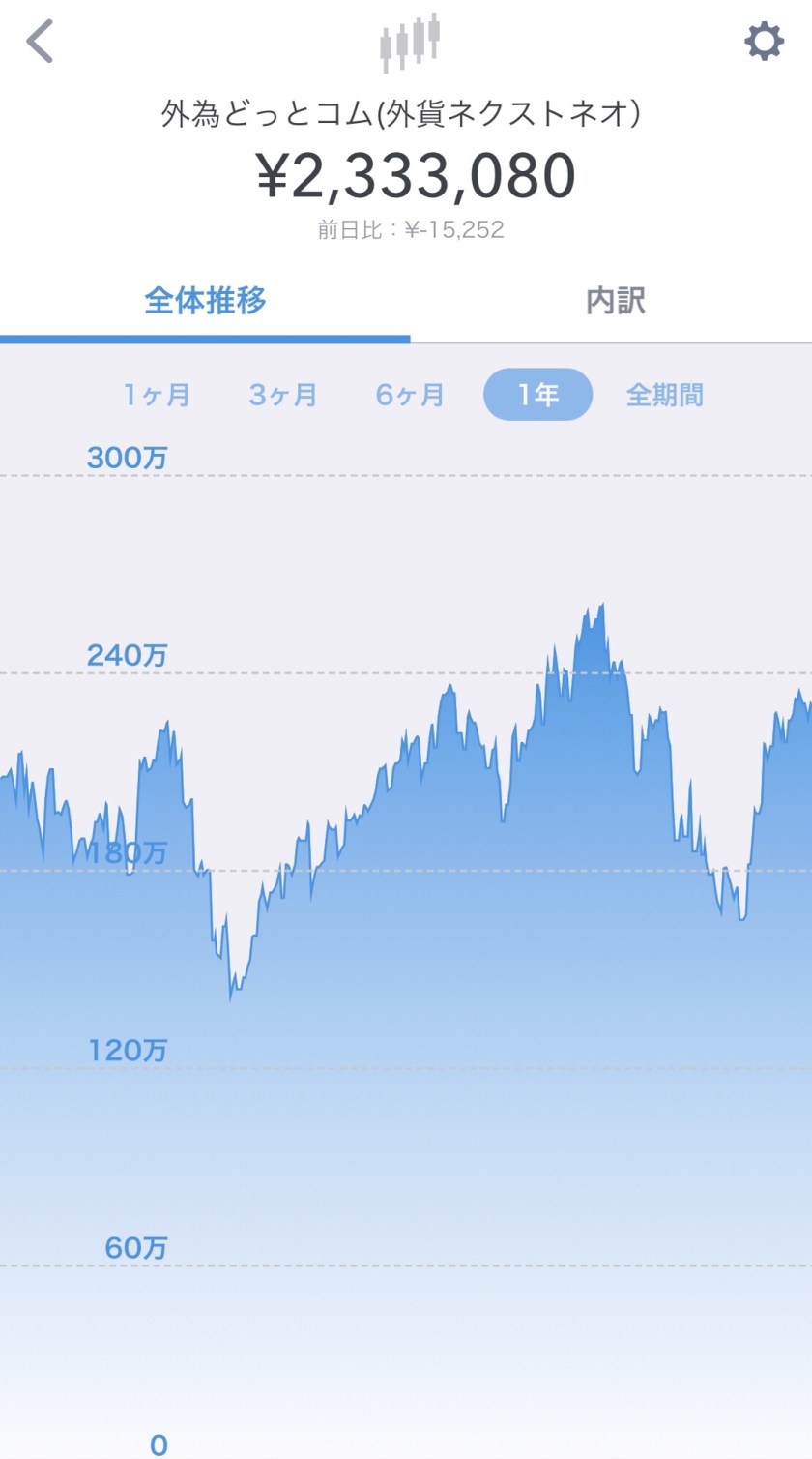 これはしばらく順調に推移したのですが、秋に高金利通貨が揃って大きく下落し、危機に陥りました。現在ではなんとか安定を取り戻しているものの、黙って待っていればスワップを得られるといった簡単なものでもないことを知りました。下のグラフにある大きな凹みではっきり表されてますね。見事に二つ凹んでます。